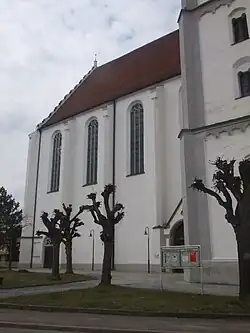 Ein hoher quadratischer Turm mit achteckigem Obergeschoss und flacher welscher Haube ist ca. 57 Meter hoch. Östlich davon befindet sich die zweistöckige Sakristei, die ehemalige Sebastianskapelle, die schon 1491 erstmals erwähnt wurde.