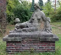 Am Zugang zur Rotkäppchenstraße steht die Figurengruppe Mutter mit Kind, geschlagen aus Muschelkalk. Eine auf dem Boden sitzende, knapp bekleidete Mutter streichelt mit der linken Hand einen Windhund, die rechte Hand streckt sie ihrem nackten kleinen Kind entgegen. Die Gruppe ist auf einer langrechteckigen Plinthe und diese auf einem gemauerten Sockel platziert.[2]