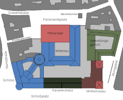Der Hessische Landtag nutzt heute nicht nur das ehemalige nassauische Residenzschloss selbst, sondern auch mehrere angrenzende Gebäude. Dazu zählen das ebenfalls zum Schlossplatz hin ausgerichtete Kavaliershaus sowie die ehemalige Kaiser-Wilhelms-Heilanstalt, heute Wilhelmsbau genannt. Im zum rückwärtig gewandten Innenhof des Schlosses entstand 1960 bis 1962 an Stelle der ehemaligen Reithalle der Plenarsaal des Landtags, welcher von 2004 bis 2008 durch einen Neubau ersetzt wurde. Im Folgenden werden die einzelnen Gebäude näher beschrieben.