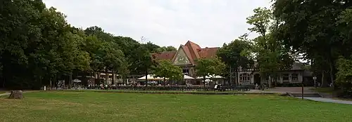 Als Restaurant „Waldschänke“ und Kurhaus wurde der erste Teil des heutigen Gebäudekomplexes 1901/1902 nach Plänen des Architekten Hermann Bergerfurth (1874–1909) zur gastronomischen Ausstattung eines von Fritz Rosorius (1845–1906) entworfenen Landschaftsparks erbaut. Grundlage war eine Schenkung des Krefelder Seidenbarons Wilhelm Deuß. Der Stifter Wilhelm Deuß und der Krefelder Bürgermeister Ernst Küper eröffneten das Gebäude am 8. Juli 1902. Nach einer weiteren Stiftung von Deuß konnte die Anlage in den Jahren 1910/1911 durch einen Anbau mit Veranstaltungssälen und Terrasse beträchtlich erweitert werden. Die Pläne hierzu lieferte der Jugendstil-Architekt Georg „Jörg“ Bruggaier (1878–1951), der kurz zuvor auch das Klärwerk Krefeld entworfen hatte. Gestalterische Markenzeichen des Anbaus sind das voluminöse Walmdach mit Fledermausgauben und der zentrale Dreiecksgiebel an der Nordseite. Das Giebelfeld schmückt ein monumentales Jugendstil-Mosaik von Adolf Münzer, das die Göttin Artemis (Diana) auf der Kerynitischen Hirschkuh mit einem schwarzen Raben[1] zeigt.