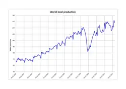 Im Zuge der Finanzkrise nahm die Stahlnachfrage kurzzeitig rapide ab. Im Mai 2009 hatten sich in der Folge die Weltmarktpreise gegenüber dem Höchststand im Juli 2008 mehr als halbiert. Insgesamt wurden 2009 weltweit 1232,3 Millionen Tonnen Stahl produziert (2008: 1329,2 Mio. t). Gegenüber dem Vorjahr betrug der Rückgang 7,3 %. Das mit großem Abstand bedeutendste Herstellerland war die Volksrepublik China mit 573,6 Mio. t (2008: 500,3 Mio. t). Der chinesische Anteil an der weltweiten Produktion lag bei 46,5 %. Das Land steigerte seine Stahlerzeugung gegenüber dem Vorjahr um 14,7 %. Die Weltproduktion ohne China lag 2009 bei 658,7 Mio. t (2008: 828,9 Mio. t). Sie sank gegenüber dem Vorjahr um 20,5 %. Im Jahr 2010 hatte sich die weltweite Produktion wieder erholt.