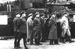 (Von rechts nach links:) Stalin, (unbekannt), der für den Bau verantwortliche stellvertretende OGPU-Leiter Genrich Jagoda, Kliment Woroschilow, (unbekannt) und Sergei Kirow bei der offiziellen Besichtigung des neu eröffneten Weißmeer-Ostsee-Kanals (Juli 1933)[69]