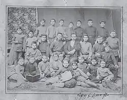 Schüler und Lehrer der Kirchenschule von Gori, Russisches Kaiserreich (1892). Iosseb Dschughaschwili befindet sich als Vierter von links in der oberen Reihe. Es handelt sich um die älteste öffentlich bekannte Fotografie von Stalin.