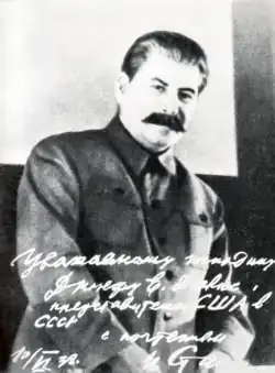Josef Wissarionowitsch Stalin (russisch Иосиф Виссарионович Сталин, wissenschaftliche Transliteration Iosif Vissarionovič Stalin; geboren als Iosseb Bessarionis dse Dschughaschwili, georgisch იოსებ ბესარიონის ძე ჯუღაშვილი, russisch Иосиф Виссарионович Джугашвили Iosif Wissarionowitsch Dschugaschwili, wissenschaftliche Transliteration Iosif Vissarionovič Džugašvili, russische Aussprache anhören – * 6. Dezemberjul. / 18. Dezember 1878greg.[1] in Gori, Gouvernement Tiflis, Russisches Kaiserreich, heute Georgien; † 5. März 1953 in Kunzewo bei Moskau, Sowjetunion, heute Russische Föderation) war ein sowjetischer kommunistischer Politiker georgischer Herkunft und Diktator der Sowjetunion von 1927 bis 1953.[2] Den Kampfnamen Stalin, der nach verschiedenen Deutungen[3] für „der Stählerne“ steht, nahm er 1912 an.