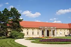 • Die Reithalle – der besonders prächtig gestaltete Südflügel mit repräsentativem Portal – wurde noch vor 1690 nach Plänen von Johann Bernhard Fischer von Erlach fertiggestellt, der aber nicht bis zum Abschluss des Projekts daran beteiligt war. Nachdem die Seitenflügel angebaut waren, wurde die Reithalle um 1700 noch einmal umgestaltet.[1]