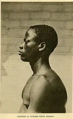 Stammeszeichen der Yoruba (yoruba: ila) sind Skarifizierungen, die zur spezifischen Identifikation und Verzierung im Gesicht oder auf dem Körper der Angehörigen der Yoruba angebracht wurden. Die Stammeszeichen sind seit vielen Jahrhunderten Teil der Kultur der Yoruba und wurden gewöhnlich in der frühen Kindheit durch Einbrennen oder Einschneiden in die Haut eingebracht.[1] Die primäre Funktion der Stammeszeichen war die Identifikation des Stammes, der Familie oder des patrilinearen Erbes einer Person.[2][3] Andere sekundäre Funktionen der Zeichen waren dekorativer Art und Ausdruck der Kreativität der Yoruba. Diese Praxis war bei den Yoruba in Nigeria, Benin und Togo sehr verbreitet, wird aber in neuerer Zeit nicht mehr praktiziert.[4]