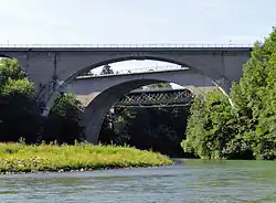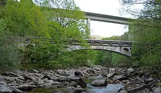 Vorne das Stampfbeton-Aquädukt (1885) über die Murg im Nordschwarzwald, dahinter eine moderne Stahlbetonbrücke im Verlauf der B 462