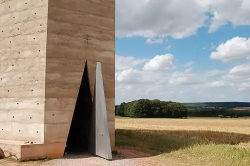 Ein aktuelles und prominentes Beispiel für ein Bauwerk aus Stampfbeton ist die Bruder-Klaus-Feldkapelle in Wachendorf des Schweizer Architekten Peter Zumthor. Er umschloss ein konisches Holzgerüst mit einem polygonalen Mantel aus Stampfbeton, der aus rötlichgelbem Sand, Flusskies und weißem Zement Schicht für Schicht aufgebaut wurde. Das Holzgerüst wurde anschließend, quasi als ‚verlorene‘ Innenschalung, in Brand gesetzt und verkohlt. Übrig blieb ein rußgeschwärzter Innenraum.[6][7][8]