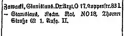 Ausgabe 221 vom 25. November 1914 (Preußen 85), S. 2908 („Garde-Jäger-Bataillon, Potsdam. Stab. (…) U. Arzt Dr. Stanislaus Zawatzki – Potsdam – i. franz. Gefgsch.“). - ↑ Adressbuch Berlin 1919