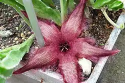 Bei der Stapelia handelt es sich um eine sogenannte Täuschblume: Indem sie Aasgeruch imitiert und in ihrem Erscheinungsbild einer Fleischwunde ähnelt, täuscht sie vor, ein geeignetes Eiablagesubstrat für Fliegen zu sein. Diese werden angelockt, legen dort ihre Eier ab und werden so als Bestäuber benutzt.