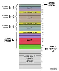 Stapelzeiger können auf den Ursprung eines Stapels oder auf einen begrenzten Adressbereich entweder über oder unter dem Ursprung zeigen, abhängig von der Richtung, in die der Stapel wächst. Der Stapelzeiger kann jedoch den Ursprung des Stapels nicht überschreiten. Mit anderen Worten, wenn der Ursprung des Stapels bei der Speicheradresse 1000 liegt und der Stapel nach unten in Richtung der Speicheradressen 999, 998 usw. wächst, darf der Stapelzeiger niemals über 1000 auf 1001, 1002 usw. hinaus erhöht werden. Wenn eine Pop-Operation auf dem Stapel bewirkt, dass sich der Stapelzeiger über den Ursprung des Stapels hinaus bewegt, tritt ein Stapelunterlauf auf. Wenn eine Push-Operation bewirkt, dass der Stapelzeiger über die maximale Ausdehnung des Stapels hinaus erhöht oder verringert wird, tritt ein Stapelüberlauf auf.