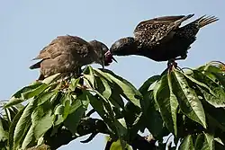 Altvogel füttert bereits flüggen Jungvogel mit Kirschen