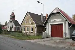 - Die Herz-Jesu-Kirche von 1934–1935 ist ein Steinbau mit Ziegelpfeilern zwischen spitzbogigen Fenstern. Die Vorderfront besitzt einen Giebel, rückwärtig ist ein Turm angebaut. Der Turm trägt vier Giebel, einen vierkantigen Helm mit Kugel und Kreuz. Im Inneren steht im Chor über dem Tabernakel eine Herz-Jesu-Statue. An die Rückwand ist ein Engel mit Palme in der einen Hand und Kreuz und Lilienstengel in der anderen Hand gemalt.[1]