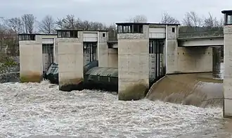 | Breite der Wehrfelder: | 2 Versenkschütze, 1 Rollschütz zu 22,60 m |