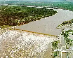 Das Absperrbauwerk ist eine Staumauer aus Beton mit einer Höhe von 8,8 m (29 ft) über der Gründungssohle. Die Mauerkrone liegt auf einer Höhe von 399 m (1310 ft) über dem Meeresspiegel. Die Länge der Mauerkrone beträgt 344 m (1128 ft). Das Volumen des Bauwerks beträgt 26.759 m³ (35.000 cubic yards).[2]