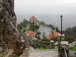 Der Klosterkomplex umfasst außer den Konventsgebäuden mit der Klosterkirche auf der Höhe des Berges eine etwas niedrigere Geländeterrasse mit der Kirche aller Heiligen Zyperns (Παρεκκλήσιον των Πάντων των εν Κύπρω Αγίων) und einem Buchladen. Der Zutritt zum eigentlichen Kloster ist, ähnlich wie auf dem Berg Athos, nur Männern gestattet.[3]