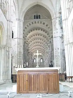 Der frühgotische Chor von Vézelay hat im Unterschied zum Schiff einen dreigeschossigen Wandaufbau, bestehend aus den Arkaden des Chorumgangs, den Arkaden des Emporengeschosses und den Obergaden. Die Umgangsarkaden sind spitzbogig. Die Arkaden der Empore sind als Biforien gestaltet, mit spitzbogigen Öffnungen aber noch rundbogigen Überfangbögen. Die Obergadenfenster sind spitzbogig, wenn auch noch ohne Maßwerk, aber die Schildbögen darüber sind rundbogig. Wie bei vielen gotischen Kirchen Frankreichs, nicht zuletzt Notre-Dame de Paris, sind die Stützen im Erdgeschoss Säulen, fangen die für die gotische Architektur typischen Dienste erst auf deren Kapitellen an.