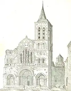 Im Westen ist dem Bau ein ebenfalls dreischiffiger, drei Joche langer Narthex vorgelagert, stilistisch im Übergang von der Romanik zur Gotik. Ihm verdanken die Tympana und die Kapitelle ihren hervorragenden Erhaltungszustand. Eine solche Vorhalle wurde u. a. als zusätzliche Station für die raumgreifenden Prozessionen des cluniazensischen Ritus genutzt.[14]