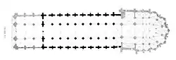 Die Abmessungen des Langhauses betragen 62,5 m in der Länge des Kirchenschiffs und 50 m in der Breite (19 m in der Breite des Mittelschiffs und je 12 m bei den Seitenschiffen).[11] Die Angaben zur Innenhöhe variieren von 18,6 m Gewölbehöhe im Mittelschiff bis zu 22 m.[12]