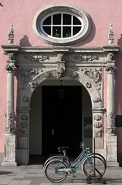 Im Erdgeschoss des Hauses befanden sich früher (jetzt sind dort Schaufenster) die ältesten Messegewölbe Braunschweigs. Das frühbarocke Portal des Gebäudes wurde wahrscheinlich bereits um 1630 von dem Bildhauer Ulrich Stamm an anderer Stelle geschaffen.[1] Es weist Rundbögen mit Masken sowie Löwen- und Engelsköpfen, ionische Säulen und Obelisken auf.