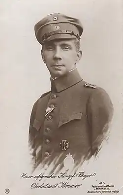 Kirmaier begann im Ersten Weltkrieg als Infanterist und wurde später zur Fliegertruppe versetzt. Während seiner Zeit im „Kampfeinsitzerkommando Jametz“ erzielte er im Juli 1916 seine ersten drei Abschüsse. Danach wurde er zur Jagdstaffel 2 unter dem Kommando von Oswald Boelcke versetzt. Zwischen dem 17. und 26. Oktober 1916 erzielte er weitere vier Abschüsse.[1] Am 28. Oktober 1916 wurde Boelcke im Einsatz getötet, woraufhin Kirmaier mit dem Kommando über die Staffel betraut wurde. Noch im November des Jahres 1916, als er das Kommando innehatte, erzielte er vier weitere Abschüsse. Am 22. November 1916 starb Oberleutnant Kirmaier im Einsatz durch einen Kopfschuss von John Oliver Andrews oder Kelvin Crawford.[3] Am 22. November erhielt er das Ritterkreuz des Königlichen Hausordens von Hohenzollern mit Schwertern.[2]