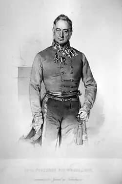 1818: Quadriert mit Mittelschild, der in Schwarz auf einem Dreihügel einen gekrönten goldenen Löwen zeigt, welcher in der rechten Pranke ein Schwert schwingt, in der Linken eine Tartsche vor sich hält. Im ersten, roten Feld eine strahlende Sonne; im zweiten und dritten silbernen Feld eine brennende Bombe: im vierten, roten Feld ein Halbmond. Auf dem Schild ruht die Freiherrnkrone.[16]