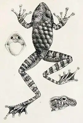 Stefania evansi. Abbildung aus der Erstbeschreibung durch Boulenger 1904. das Weibchen trägt 22 Eier auf dem Rücken.[1] | ||||||||||||