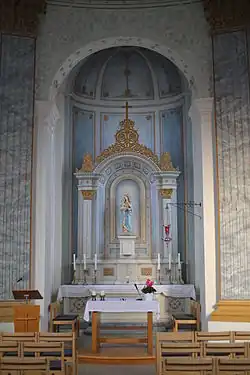 Im östlichen Kreuzarm befindet sich der Hochaltar, während sich ihm gegenüber im Westen das Portal öffnet. Süd- und Nordarm sind als Seitenkapellen mit je einem Altar ausgestattet. Den Hochaltar und die beiden Seitenaltäre gestaltete Franz Joseph Feuchtmayer.