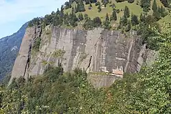 Felswand am Steigelfadbalm-Dossen. Die Höhle befindet sich unterhalb des Wasserfalls.