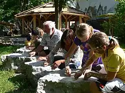 - Die einzelnen Bausteine mit der Dauer von je 30 Minuten werden nach dem Baukastenprinzip je nach Belieben kombiniert: Amulett anfertigen aus Speckstein, Feuerstein bearbeiten, Brot backen im Lehmofen, Ammoniten schleifen.