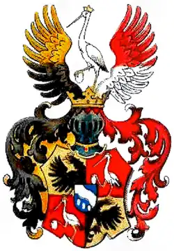 Geviertelt mit Herzschild, in diesem in Blau gefluteter silberner Schrägrechtsbalken, unterhalb desselben der Länge nach drei Steine. 1 und 4 in Gold ein gekrönter schwarzer Adler, aus der Spaltungslinie wachsend. 2 und 3 in Rot ein silberner gold gekrönter Kranich, einen Stein in der rechten Kralle tragend. Auf dem Helm die Krone. Aus der Krone steigt rechts ein offener, rot-silberner, rechts ein offener, grün-goldener in der Mitte geteilter Flug, dazwischen der Kranich aus dem Schild. Die Helmdecken sind links rot-silbern und rechts grün-golden.[1]