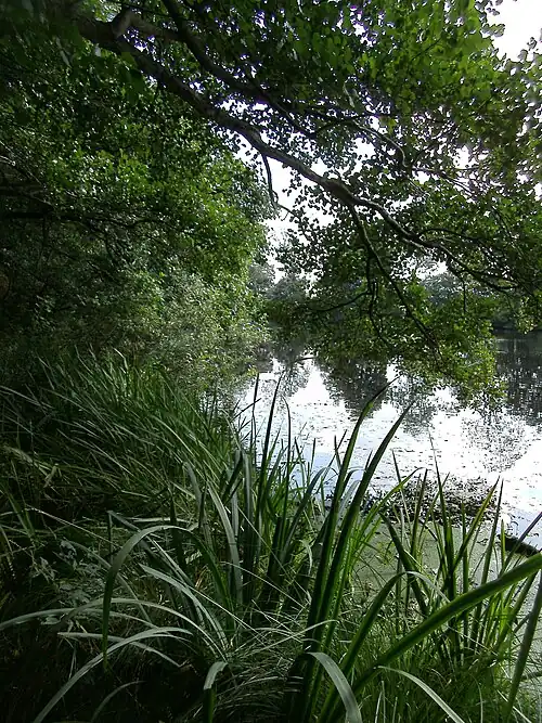 Der zum Mühlenteich aufgestaute Steinbeck bei Hagen, Nordufer (September 2021) | ||