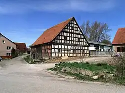- Haus Nr. 9: Bauernhaus, eingeschossiger Satteldachbau, Zwerchhaus, mit Gliederung teils in Naturstein, bezeichnet 1802[18]