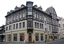 Die Gebäude entstanden im Jahr 1903. Die Ecksituation wird durch einen schmalen Erker vor den oberen Geschossen betont. Darüber hinaus besteht ein an einen Risalit erinnernder Erker. Die oberen Gebäudeteile sind mit einem reich ausgestaltetem Zierfachwerk geschmückt.