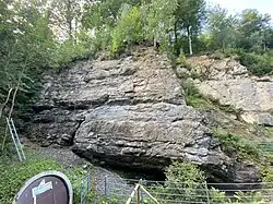 - „Die Steinbruchwand zeigt einen Profilausschnitt aus den Ems-Eifel-Grenzschichten (früher „Schichten der cultrijugatus-Zone“). Die Schichtenfolge beginnt im unteren (z. T. verschütteten) Steinbruchteil mit biodetritischen, fossilführenden Kalksteinbänken. Sie gehen nach oben in dunkle Mergelsteine mit Crinoiden, Korallen und Brachiopoden und dann in feinsandige, graue Tonsteine über.“[1]