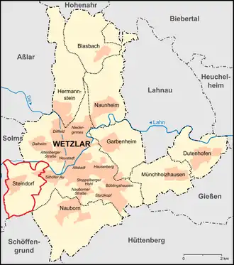 - ↑ Am 1. August 1979 wurde die Stadt Lahn aufgelöst und Blasbach, Dutenhofen, Garbenheim, Hermannstein, Münchholzhausen, Nauborn, Naunheim und Steindorf wurden Stadtteile der Stadt Wetzlar.