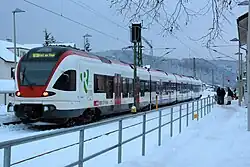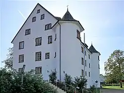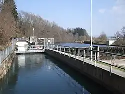 1984 wurde das Ausleitungskraftwerk am Fluss Wiese in Betrieb genommen und im Jahr 2007 mit einer neuen Fischtreppe versehen. Der mittlere Abfluss des Gewässers beträgt hier 10,62 m³/s.[67] Das Wasser wird über einen Kanal mit einer Fallhöhe von 7,5 Meter durch zwei Kaplan-Kegelrad-Rohrturbinen geführt. Das Wasserwerk erzeugt bei einer installierten Leistung von 1000 Kilowatt (kW) eine mittlere Jahresstromproduktion von 3,3 Mio. Kilowattstunden (kWh).[68], was dem Stromverbrauch von über 1000 Haushalten entspricht.