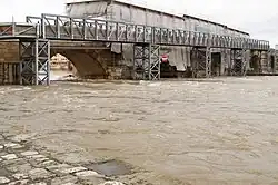 Im Zuge von Instandsetzungsarbeiten ab 1950 erhielt die Brücke Brüstungen aus Betonplatten. 1958 wurden zur Erfüllung eines amerikanischen Dekrets jeweils zwei Sprengkammern in die vier Pfeiler 3 – 6 eingebaut, was die Struktur der Pfeiler erheblich schwächte. Die militärhistorische Bedeutung dieser Einbauten hatte zur Folge, dass diese Sprengkammern in die Denkmalliste eingetragen wurden.[31] Bis 1962 wurden die Beschlächte auf ihren heutigen Umfang zurückgebaut und als Schutz gegen Unterspülungen stählerne Spundwände und massive Betonkonstruktionen um die Pfeiler herum gebaut.