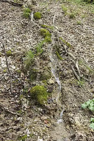 Das Grundwasser kann hier aufgrund der darunterliegenden wasserstauenden Schicht des Ornatentons nicht tiefer versickern und wird seitlich zum Quellaustritt geleitet.