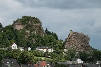Die Burgruine Steinkallenfels wurde 1212 erstmals urkundlich erwähnt und war ursprünglich Reichslehen der Herren von Stein, später Herren von Steinkallenfels genannt (ausgestorben 1778). Bereits 1150 und 1158 wird ein Hugo von Stein erwähnt, der sich vielleicht nach der Burg nennt. Seit dem 14. Jahrhundert war sie Ganerbenburg. In einem Burgfriedensvertrag von 1371 werden 25 Mitbesitzer genannt, die Anteile an der Burg hatten, aber vermutlich nicht alle dort wohnten. 1523 wurde die Burg im Ritterkrieg erobert.[1] 1615 wurde die Burg bereits als baufällig bezeichnet. Schließlich wurde sie 1682/84 von den Franzosen gesprengt und ist seither Ruine.