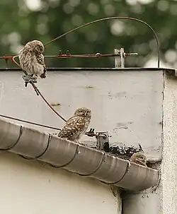 Während die Jungvögel noch in der Nisthöhle sind, füttert nur das Weibchen.[14] Das Männchen trägt Beute heran, übergibt sie aber in der Regel dem Weibchen.[25] Auf die Fütterungslaute des Weibchens reagieren die zunächst blinden Jungvögel mit einem gerichteten Betteln. Ab dem 12. Lebenstag richten sie sich zur Beuteabnahme auf, indem sie die Fersengelenke strecken. Die Jungvögel verlassen im Alter von 22 bis 24 Tagen die Nisthöhle und klettern in die nähere Umgebung. Sie sind zu diesem Zeitpunkt noch nicht flügge; das frühzeitige Verlassen der Nisthöhle verringert jedoch die Gefahr, dass Beutegreifer sie in der Nisthöhle greifen können.[100] Ab dem 30. bis 32. Lebenstag können Jungvögel kurze Strecken fliegen. Sie halten sich bis zu einem Lebensalter von 40 Tagen in der Nähe der Bruthöhle auf und werden von beiden Elternvögeln gefüttert.[101] Mit zunehmendem Alter jagen die Jungvögel auch selbst. Der Familienverband löst sich auf, wenn die Jungvögel ein Alter von zwei bis drei Monaten erreicht haben.[94] Der größte Teil der Jungvögel siedelt sich in einer Entfernung von weniger als 10 Kilometer vom Geburtsort an. Nur knapp 10 Prozent der Jungkäuze errichten ihr Revier in einer Entfernung von über 100 Kilometern.[102][103] Im Herbst ihres Geburtsjahres beherrschen die jungen Steinkäuze fast das ganze Stimmrepertoire und verbreiten auch den Reviergesang.[66]