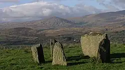 - Neben den beiden Menhiren befindet sich ein kleiner Cairn, in dem sich ein Kreis aus kleinen, aufrecht gestellten Steinen befindet, die radial angeordnet, also mit ihren Längsachsen strahlenförmig nach außen gerichtet sind und als „Radial-stone cairns“ (nur 14 erhaltene) bezeichnet werden, weil die Steine mit ihrer Schmalseite zum Mittelpunkt zeigen.