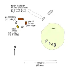 - Zum Kreis gehören zwei in der Nähe aufgestellte Menhire, von denen einer eine Resthöhe von über vier Metern aufweist. Ursprünglich war er über sechs Meter hoch. Wie die meisten außenstehenden Menhire (englisch outlier) liegen sie auf der Nordost-Südwest-Achse, auf die auch der Kreis mit seinem „axialen Stein“ und dem Portal ausgerichtet ist.