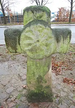 Das Kreuz befindet sich westlich der Straße von Welfesholz nach Sandersleben am nördlichen Ortsausgang. Es besteht aus Buntsandstein und hat eine Höhe von 1,68 Meter. Die maximale Breite des lateinischen Kreuzes beträgt 1 Meter bei einer Stärke von 0,28 Metern. Auffällig ist eine auf der straßenabgewandten Seite vorhandene verwitterte, radähnliche Darstellung mit einem Durchmesser von 0,56 Metern. Das Rad hat zehn, möglicherweise auch zwölf Speichen. In der Mitte des Rades befindet sich eine etwa vier Zentimeter tiefe Vertiefung, die auch auf der anderen Seite des Kreuzes zu erkennen ist. Sowohl am Schaft des Kreuzes als auch am Arm auf der Nordseite sind Beschädigungen zu erkennen. Das vermutlich vom Ende des 14. oder Anfang des 15. Jahrhunderts stammende Kreuz weist deutliche Verwitterungsspuren auf, ist jedoch verhältnismäßig gut erhalten.