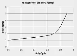 Beispiel für den Fehler der Steinmetzformel bei Duty-Cycle >50 % (f=100 kHz; MnZn-Kern)