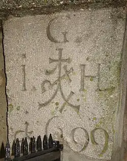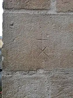 In der Literatur begegnet man mitunter auch dem Begriff Maurerzeichen[2][3][4][5] (etwa Döderlein im 18. Jahrhundert bzgl. einiger Zeichen im Gewölbe der Burg Cadolzburg)[6][7], der sich nicht auf das Maurer-Zunftzeichen bezieht, sondern teils synonym für Steinmetzzeichen benutzt wird (wohl wegen einer früher weniger üblichen strikten Trennung der Termini „Steinmetz“ und „Maurer“)[8] und teils eine Abweichung beschreibt.[9] Im Zusammenhang mit mittelalterlichen Backsteinbauten unterstellt bspw. Perlich (2007), dass ein genuines Maurerzeichen eine Übernahme von Traditionen der Steinmetze und des Werksteinbaus darstelle und analog zu einem Schlussstein ein Zeichen für die Beendigung eines Baus sein könnte.[10]
