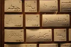 Im persischen Reich waren Steinmetzzeichen dagegen verbreitet. Die frühesten Belege stammen aus der Zeit Kyros des Großen aus Pasargadae,[16] und ähneln älteren Ziegelstempeln aus Ekbatana.[17] Weitaus mehr Steinmetzzeichen sind aus dem Palast von Persepolis belegt.[18]