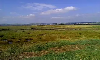 Die doppelte Steinreihe auf dem Marschland wird in der Regel von Schlamm und Gezeitenmüll bedeckt. Bei Niedrigwasser sind an den Enden fünf Steine sichtbar.