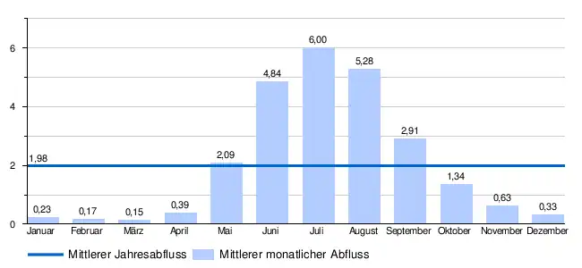 - ↑ Martin Pfaundler, Rolf Weingartner, Robert Diezig: „Versteckt hinter den Mittelwerten“ – die Variabilität des Abflussregimes. In: Hydrologie und Wasserbewirtschaftung (HyWa). Jg. 50, Heft 3, 2006, S. 116–123, hier Tabelle auf S. 119 (Download [PDF; 3,2 MB; abgerufen am 1. November 2024]). Abrufbar unter Gesamtes HyWa Heft 3, 2006..