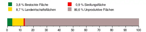 Es besteht zu 3,8 % aus bestockter Fläche, zu 8,7 % aus Landwirtschaftsfläche, zu 0,9 % aus Siedlungsfläche und zu 86,6 % aus unproduktiven Flächen.